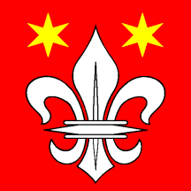 Gules, a Fleur-de-lys Argent between in chief two Mullets of Six Or.