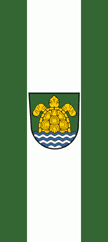 It is a green-white-green vertical triband with ratio of stripes approx. 3:7:3. The coat of arms is in the middle of the white stripe.