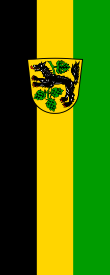 It is a black-yellow-green vertical tricolour. The coat of arms is shifted towards the top.