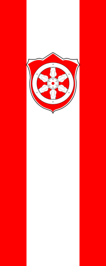 It is a red-white-red vertical triband with ratio of stripes approx. 1:3:1. The coat of arms is shifted to the top within the central stripe.