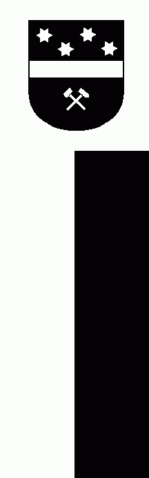 The black shield is divided by a silver (=white) barrulet. Above a re four silver (=white) 6-point stars scattered over the field, below in the centre are silver (= white) hammer and mallet.