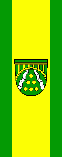 It is a green-yellow-green vertical triband with ratio of stripes 1:3:1. The coat of arms is in the middle of the yellow stripe.