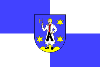 The flag is off-centred quartered of blue and white with arms shifted to top.