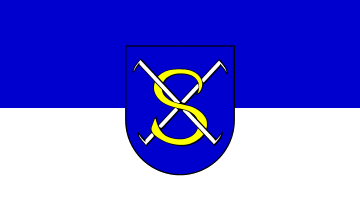 It is a blue-white vertical bicolour with arms shifted to the top. The colour of the mural crown is uncertain, it is not mentioned in Günther 1996b nor on the city website.