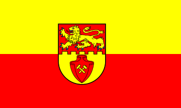 The flag's ratio is 3:5. It is a yellow over red horizontal bicolour. The coat of arms is slightly shifted to the hoist.
