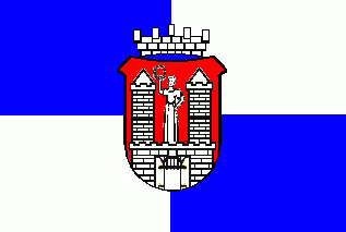 The flag is quarterly divided into blue and white. In its centre is a modified local coat of arms showing the castle white upon a red shield.