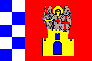 The flag (photo; image) is red with a yellow castle ensigned with Archangel St. Michael. Along the hoist are placed two columns of five square each, in turn blue and white.