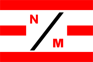 The house flag of Murueta (Bilbao), as shown by Loughran [lgr95], is horizontally divided red-white-red-white-red (c. 1:2:1:2:1), in the center a white square divided by a black diagonal stripe and charged with the red letters "N" (top) and "M" (bottom).