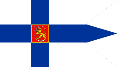 White flag with blue cross and the Finnish coat of arms in the middle of the cross. Because Finland decided to be a republic instead of a monarchy, the government thought that the crown should be removed. The shield became almost a square. Lion's armoured arm and the blades of the weapons are coloured light grey but the roses are white. The shade of the blue became darker.