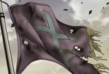 The flag of the Empire is shown in the prologue to episode 1 (screenshot): a dark-lavender field with an odd sort of double cross, mostly turquoise but with a narrow black/white border - except for the lower crossbar, which is black - and with gold fringe on the fly end only. Location is apparently supposed to be Europe, though I'm not positive.