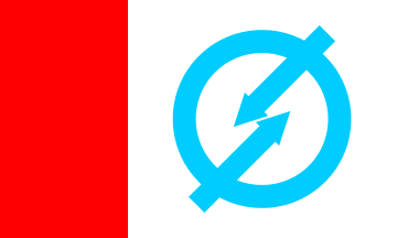 I began with red and white, which seem to me the oldest, most basic heraldic ideas. Then I created a symbol in light blue to evoke the world, the UN, and the exchange of information in a forum -- the World Wide Web. The red band along the hoist can also represent our passion for vexillology, the circle our unity, white and blue for peace, and arrows representing the technology of the modem.