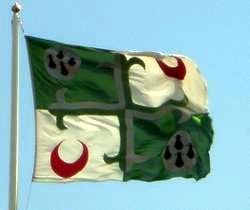 The image above is a variant of the banner of arms, shown in use with white cloth for the Argent field quarters and grey cloth for the Argent cross quarters and roundels.