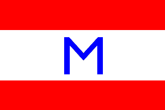 House flag: three horizontal stripes of red and white, proportioned (c.) 2:3:2; on the central stripe a Blue capital "M".