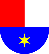 The coat of arms is in the semi-circular shield shape in the lower part and the square shape in the top part. It is divided with a horizontal and a vertical division into three parts. The top left part is red, the top right part is white. The lower part is blue with a yellow six-pointed star.