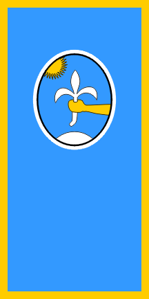 The flag (photo) is described in proportions 2:1 (vertical), blue, bordered golden-yellow with the "historical coat of arms of Grožnjan" and with a swallow-tailed fly end. A vertical flag without tail is also used.