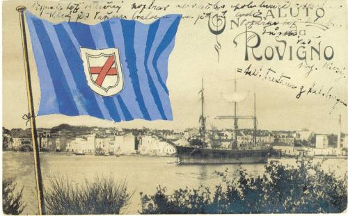 The coat of arms of Rovigno used before the Second World War, during the Italian rule (website), was basically the same as the modern one, differing in the artistic rendition. A blue flag (postcard, gonfalon) with the shield of the arms is recorded also in the 1890s, and was probably used before.