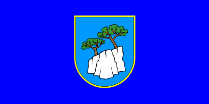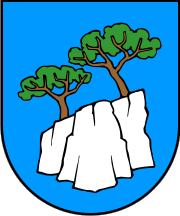 The coat of arms is described in the Statutes as "in blue on a silver/white rock two pines".