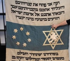• The Ship of Redemption, greeting card for the new year, New York, 1925. There are two flags there, blue over white with a golden magen-david in the centre. Below the magen-david there are inscriptions in gold. On one flag, "... for out of Zion shall go forth the law" (which continues, "and the word of the Lord from Jerusalem", Isaiah 2:3). On the other flag: "The Labour Battalion". This was an organization of pioneers in the 1920's. Its members worked in road construction.