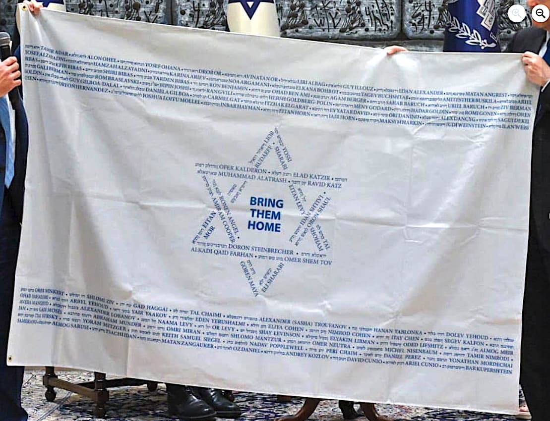 A stylized Israeli flag featuring the names of the people [still held captive since] the October