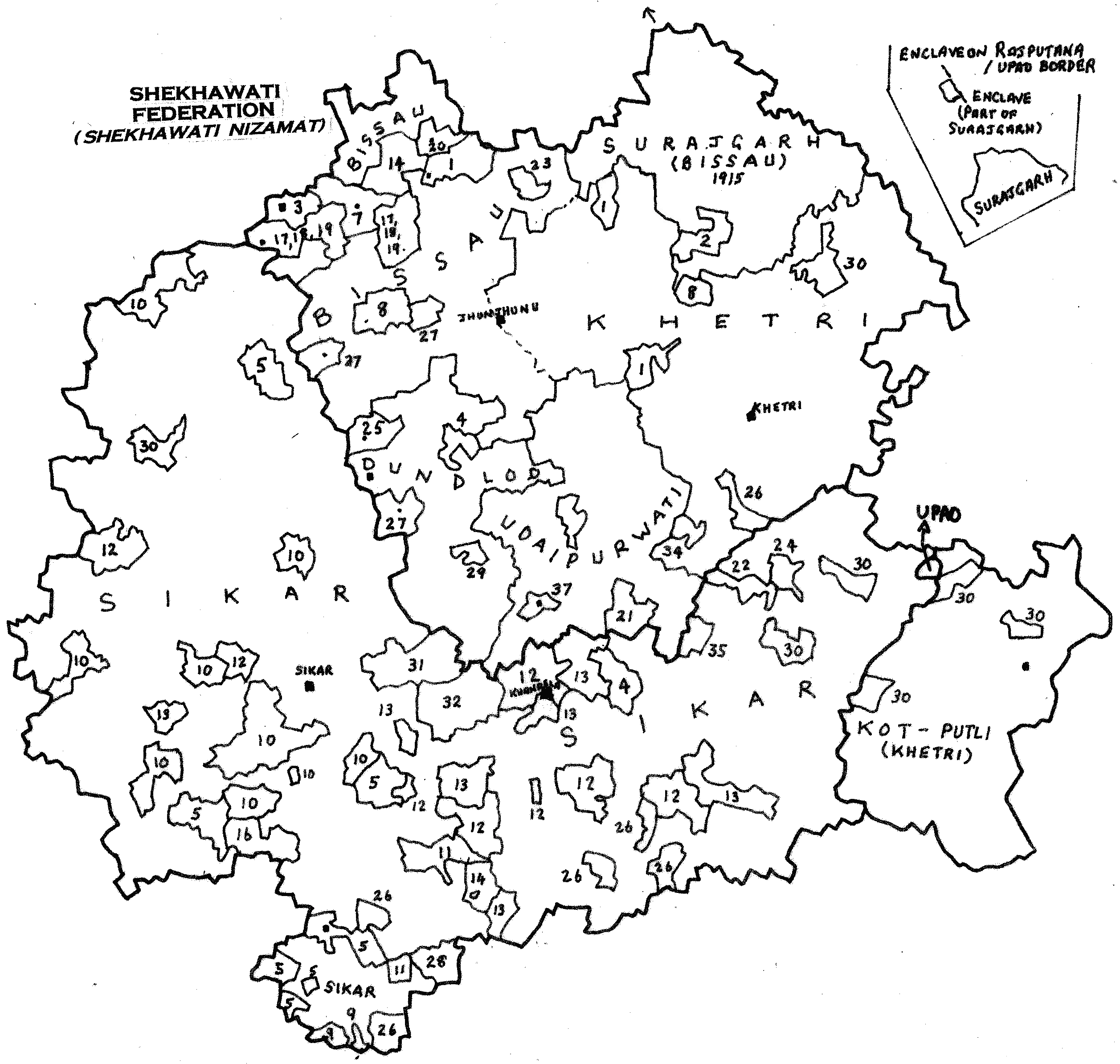 This is the best map of the SHEKHAWATI FEDERATION - SHEKHAWATI NIZAMAT which I can come up with. The table of the federation can be found here. I have not been able to find an official map which pre-dates 1949. Shekhawati is situated in Northern Jaipur, Rajasthan, the map is based upon the modern Districts of Sikar (the largest), Jhunjhunu and the Kot - Putli Pargana of Jaipur proper.