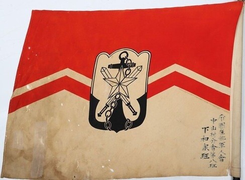 Silk printed flag for unidentified Japanese naval association with printed insignia to the centre; size: 68 x 53 ½ cms.