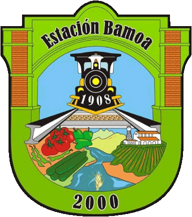 The upper half of the border carries the form of the entrance to the town and reads Estación Bamoa. At the bottom is the year 2000, when it became a syndicate. In the center is the year 1908, when it was founded, over a locomotive on railway tracks. In front, the Sinaloa River with hills is seen. To the lower-right is an image of a factory surrounded by fields for its industry. To the lower-left are products of the valley: tomatoes, peppers, cucumbers, and most importantly legumes. To the front of the river is an ear of wheat.
