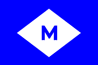 Flag: blue field, in fly white "M", in canton the Dutch colors..