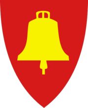 Blazon: I rødt ei gull klokke. In English: Gules a bell or.