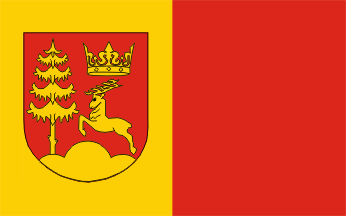 on the yellow field the Arms are placed. The fly part of the flag is red.