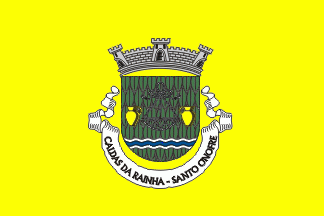 Shield Vert covered by a fishing net Argent, a shrimp-catcher Argent flanked by two jars Or, in base a bar wavy Argent charged with a barrulet wavy Azure. Mural crown Argent with three visible towers (village rank)and white scroll with inscription in black initials: "CALDAS DA RAINHA - SANTO ONOFRE".