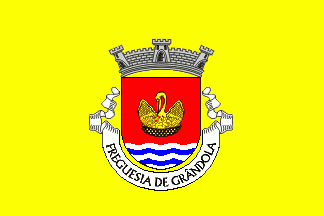 Shield Gules with base wavy of Argent and Azure, a she-pelican Or in a nest Sable garnished Or, feeding her children Or eyed Gules by her own body. Mural crown Argent with three visible towers (village rank)and white scroll with inscription in black initials: "FREGUESIA DE GRÂNDOLA".
