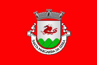 Shield Argent, a dragon Gules armed and tongued Azure, in base a triple mount issuant Vert. Mural crown Argent with three visible towers (village rank) and white scroll with inscription in black initials: "SANTA MARGARIDA DA SERRA"