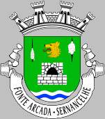 Shield Vert with base wavy of Argent and Azure, an impending well Argent masoned Sable, on chief a wolf's head Or tongued and eyed Gules, flanked by a spindle at dexter and a distaff at sinister, both Sable with yarns Argent. Mural crown Argent with four visible towers (town rank) and white scroll reading in black upper case serifed letters "FONTE ARCADA - SERNANCELHE".