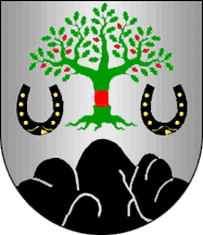 Shield Argent a eradicated cork oak Vert peeled and fruited Gules flanked by two horseshoes Sable emphasized and pierced Or, issuant from base a craggy hill Sable emphasized Argent. Mural crown Argent with three visible towers (village rank) and white scroll reading in black upper case serifed letters "MAÇORES".