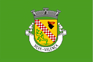 Shield Or, divided by a bendy Cistercian bar, flanked by a mattock Sable fixed Gules in sinsiter chief and a bramble Vert eradicated in dexter base. Mural crown Argent with three visible towers (village rank) and white scroll with inscription in black initials: "SILVA - VALENÇA".