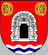 Shield Gules with base wavy of Argent and Azure, a porticus Argent masoned Sable with door of the same, in chief two watermill's wheels Or ordered per fess. Mural crown Argent with three visible towers (village rank) and white scroll with inscription in black initials "ARNOSO - SANTA EULÁLIA".