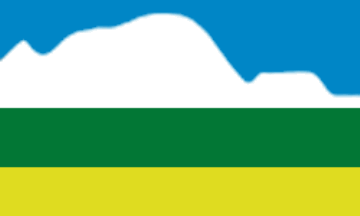 A blue and white upper field, resembling a skyline, and green and yellow horizontal bands in the lower half.
