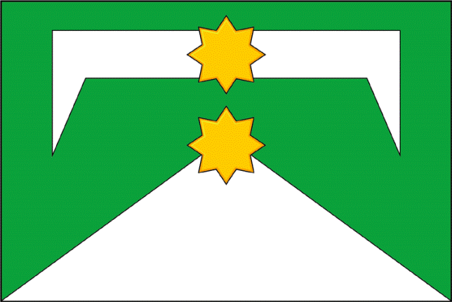 On a green field a silver shortened point, accompanied at the top by a silver bar, the lateral edges of which are extended downwards by wedges, the oblique sides inward; the bar and the top of the point are covered with gold eight-pointed stars.
