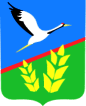 The coat of arms is a rectangular heraldic shield with rounded lower corners and a pointed tip (blue at the top, green at the bottom), divided by a red stripe running from left to right. The lower portion of the coat of arms schematically depicts ears of wheat, symbolizing the development of agriculture in the district as a priority industry. The upper portion features a crane taking flight, symbolizing movement, development, and peace, as well as the presence of a nature reserve within the district. The red stripe represents the state border.