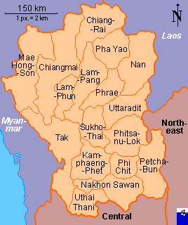 Chiang Mai (213) Chiang Rai (212) Kamphaeng Phet (204) Lampang (250) Lam Phun (251) Mae Hong Son (243) Nakhon Sawan (223) Nan (226) Phayao (272) Phetchabun (239) Phi Chit (236) Phitsanulok (237) Phrae (240) Sukho Thai (262) Tak (216) Uthai Thani (270) Uttaradit (269) |