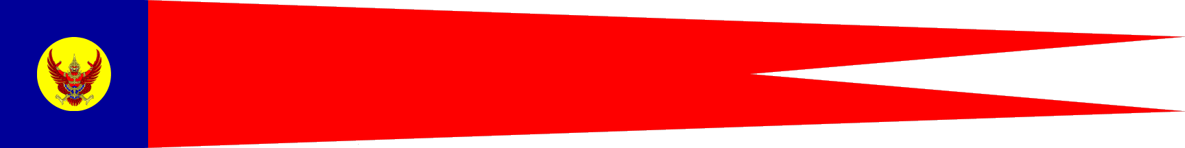 The Rajawong Noi Fai Nai is divided into two parts; the left hand side which is dark blue and measures less than 60 centimetres, contains a yellow circle in the center, in the middle of which sits the red garuda emblem. The right hand section is a red pennant which gradually tapers off into the shape of a bird's tail. This is flown whenever an order has been issued by His Majesty that there be no 21 gun salute.