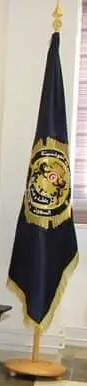 The desktop flag is a white horizontal background with the logo in the middle and a golden fringe. The full size flag is a dark blue horizontal background with the logo in the middle and a golden fringe.