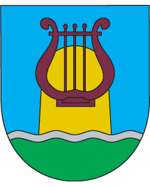"Per fess by abaised wavy barrulet argent on azure and vert. Shock or, over it is lyre purple.