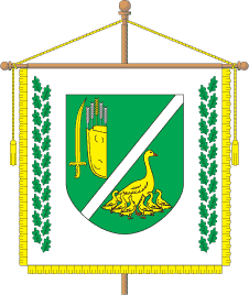 Vertically divided red-green 1:3, with a yellow ornamental trypillya on the