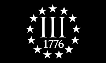 While driving my daughter to her doctor appointment this afternoon, we found ourselves stopped behind a school bus and in front of a house with some interesting flag display choices. Three flags were displayed on a flagpole, with a blue Trump 2020 campaign flag at the top above an upside-down American flag, itself above an upside-down Virginia flag. There were two additional flag poles attached to the house and flanking the front door. The pole to the right of the door held a tattered and barely recognizable white Trump 2020 flag. The pole to the left carried a black and white "III percenter" flag that I hadn't seen before. We talk about the III percent movement on FOTW showing an American flag with the Roman numeral III in white within the ring of 13 stars. The flag seen today, however, had that same Roman numeral III in white above the year "1776," all within a ring of 13 white stars and centered on a black field.