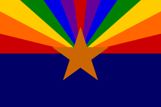 The gay flag of Arizona is derived from the state flag by repainting the red and gold rays into the rainbow colors. Several variants of this design can be found as the Web graphics, however the only one which seems to be really used is