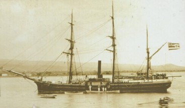 H.H.M.S. Kaimiloa at anchor in Honolulu Harbour shows the ensign flying in the