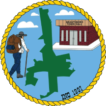 The seal depicts a hiker waking towards a green outline of the town limits. Behind the town limits is the Grantsboro town hall. At the bottom of the seal is the town's incorporation year.
