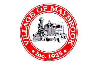 The flag for the village of Maybrook consists of the village seal centered on a white bedsheet, flag dimensions are approximately 2:3.