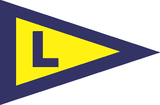 Burgee: Pennant circa 2:3 (print image). Yellow field fimbriated blue on three sides and charged with a blue capital letter L.
